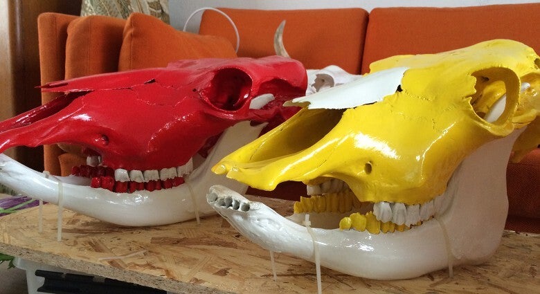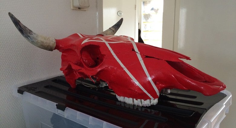 Pas na een jaar kon Alex dan eindelijk beginnen met de koppen schilderen. Ook de tanden werden weer teruggeplaatst in de originele schedels. Inmiddels zijn al zijn koppen te zien in café Roest in Amsterdam. De één rood, de ander blauw, met een lampje of mp3-speler. Je kunt het zo gek niet bedenken of Alex heeft het van een koeienkop gemaakt.