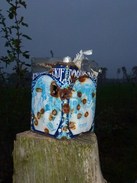 De blikken op ’t Boesveld. Ze beginnen regulier. Er zit iets lekkers – of iets moois in. Dan krijgen ze jaren een tweede leven waarbij er wel een paar gradaties zijn. De mooiste blikken krijgen een inhoud bedoeld voor menselijke consumptie. Een blik uit de tweede categorie, daar zit dierenvoer in.