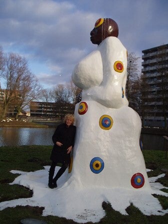 Vanuit ons appartement zien we haar staan; Moeder Aarde, of beter Moeder Aisa of nog beter M’ Aisa. Het is een groot beeld van een zwarte vrouw met een wit ‘gewaad’ en ze is gezegend met een enorme bilpartij en dito borsten. Om haar heen op de grond liggen ‘planeten’ en ééntje is in haar linkeroog geplaatst. Het beeld staat op een eilandje in de ‘Grubbezee’, een grote vijver in het park, bereikbaar door een brug. Als we mensen ontvangen hebben we altijd veel uit te leggen. Eind 2007 even niet, want er was een tent om haar heen geplaatst. Het soort tent dat ze bij ongevallen op snelwegen gebruiken, een ‘trauma tent’ zeg maar.