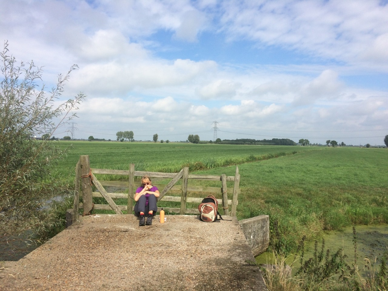 Het zonnetje is inmiddels goed doorgebroken en het wordt ernstig aangenaam. Na Kinderdijk volgen lange tiendwegen, we komen nauwelijks mensen tegen. Wel een familie zwanen met jongen, die het pad volledig blokkeren. Nou zijn zwanen niet altijd even vriendelijk, vaak zelfs ongegeneerd agressief. Dus we beginnen al een klein beetje te rekening te houden met het omloopscenario. Niet echt fijn, want een kilometer of vijf! Zij kijken naar ons, wij kijken naar hen. Ze voelen zich niet fijn. Wij ook niet, dus hier zou zomaar een band kunnen ontstaan… Dat gebeurt uiteindelijk niet, want door met tussenpozen de beesten rustig en langzaam te benaderen, neemt hun ongemak toe. Maar agressief worden ze niet. De eerste zwaan gaat het water in en duurt nog even voordat de tweede volgt. Maar daarna is het snel gebeurd.