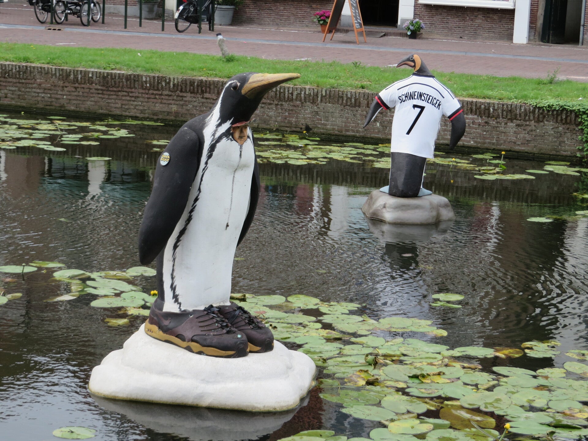 Het is een lekkere dag, bewolkt maar nog steeds een graad of twintig. In het Diemerbos zijn bramenplukkers actief, op de Gaasp de pleziervaart. In Weesp stuiten we op merkwaardig tafereel: in de gracht drijven Duitse voetbalpinguins. Een ode aan deze ijskonijnen? Of de primaire associatie met de Duitse witte voetbalshirts… Koddig is het wel en eerlijk is eerlijk, onze voetballende oosterburen zijn hier veel beter op hun plaats.